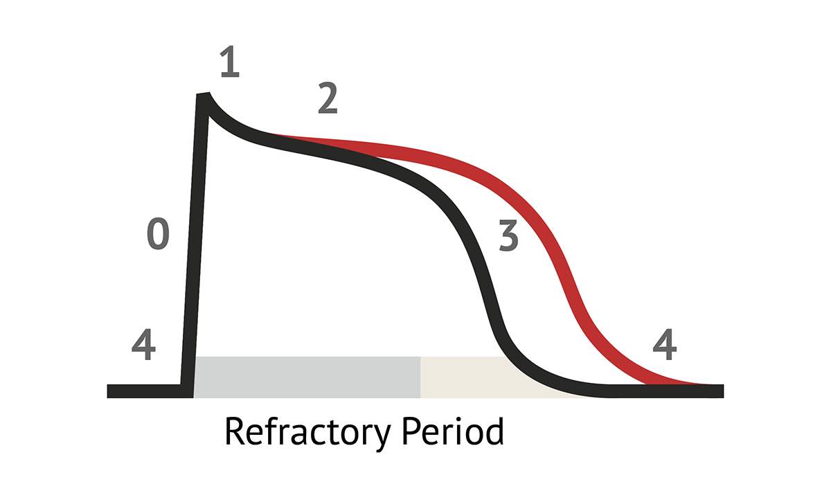 Hypercalcaemia, or an increased serum calcium concentration >2.60 mmol/L, shortens action potentials which primarily results in early ventricular repolarisation (shortened QT) on ECG.